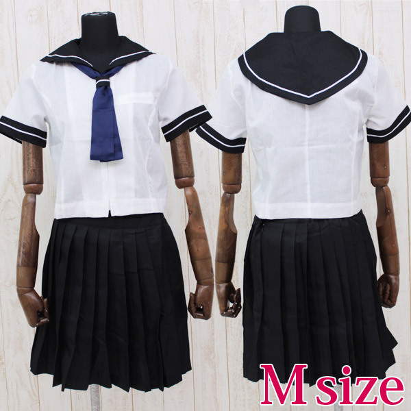 ●フロントファスナーで着用が簡単な黒×白の半袖セーラートップス●先端をカットしたボウタイ風の青いスカーフ●膝丈のプリーツスカート●袖口・襟・スカーフ留めに細い白ラインを1本入れて全体をキリッと引き締めました。