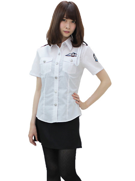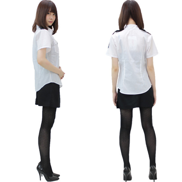 ●ホワイトカラーの半袖ブラウス(前開きボタン)●実用的なポケット付き●左肩にロープ付き(取り外し不可)●シンプルだけどオシャレ感のある銀色ボタン●スリット入りのタイトなミニスカート(後ろコンシールファスナー)●女性用Mサイズ。