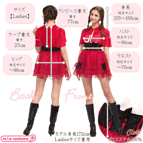 Ladiesサイズ:B〜90cm・W〜70cm・H〜96cm・身長155〜165cm・ケープ丈27cm・ワンピース丈77cm
