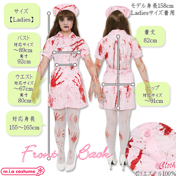 セット内容:ナースキャップ、ワンピース(前ボタン)、血糊 素材:ポリエステル100%