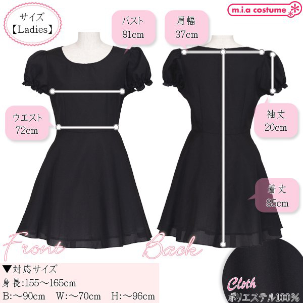 対応サイズ:身長155〜165cm・B〜90cm・W〜70cm・H〜96cm 実寸:B91cm・W72cm・肩幅37cm・袖丈20cm・着丈85cm