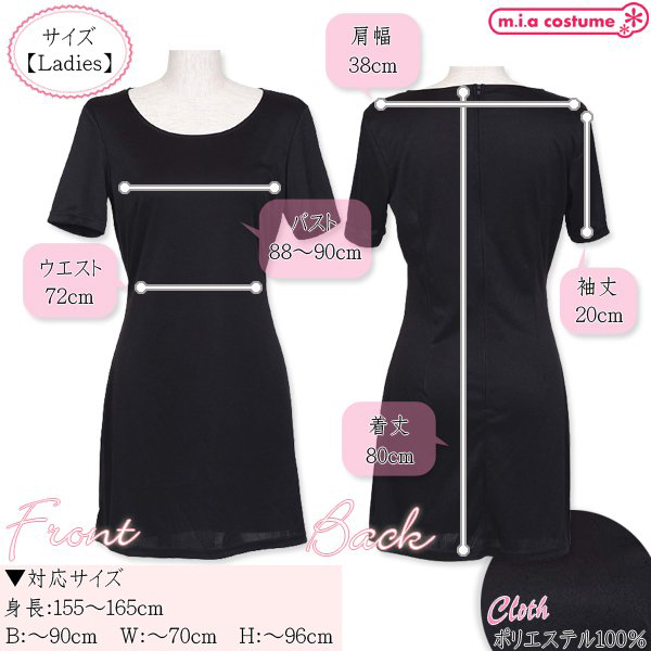 対応サイズ:身長155〜165cm・B〜90cm・W〜70cm・H〜96cm 実寸:B88〜90cm・W72cm・肩幅38cm・袖丈20cm・着丈80cm