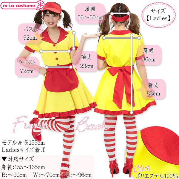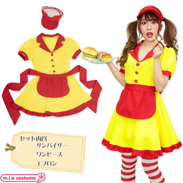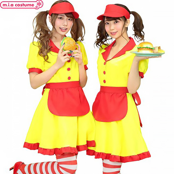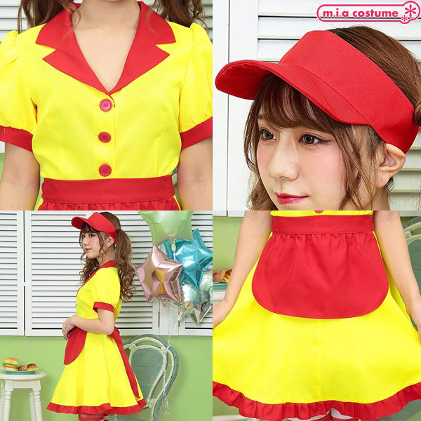 着れば気分は某有名バーガーショップの定員さん!?ファストフードの店員さんのようなコスチュームで赤と黄色のカラフルな配色が目立つこと間違いなしのウェイトレス風コスプレ衣装です♪ダイナーガール風の形がキュートでサンバイザーはサイズ調整可能!アレンジしやすい無地ベースなのでワッペン等でカスタムすれば、より本格的にお楽しみいただけます。