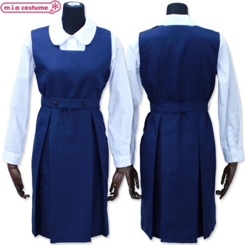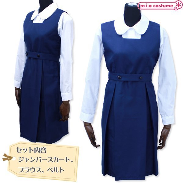 セット内容はブラウス(前ボタン)、ジャンバースカート(裏地有り・脇と肩スナップボタン留め)、ベルトと充実♪ウエストのベルトが特徴的で学園祭や催し物などにもおすすめのコスプレ衣装です。