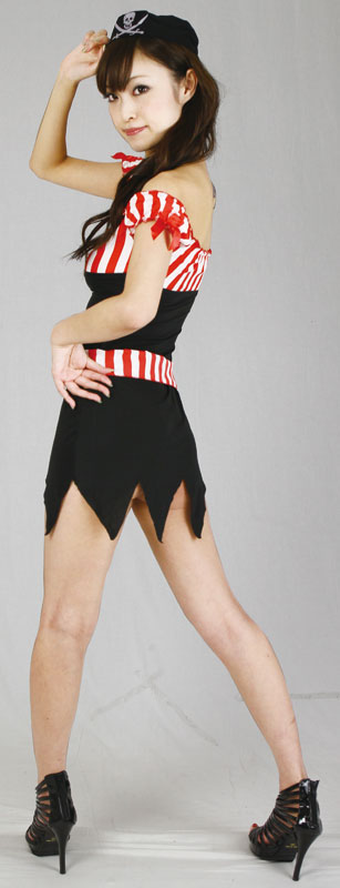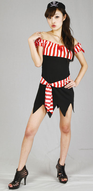 胸元と袖口には赤いリボンを施しキュートに!ウエストにはバスト周りと同じ、赤白ストライプ柄のベルトスカーフを巻いてオシャレに!ドクロの描かれた帽子を被って、パイレーツ気分で仮装パーティーやイベント会場で暴れちゃおう!