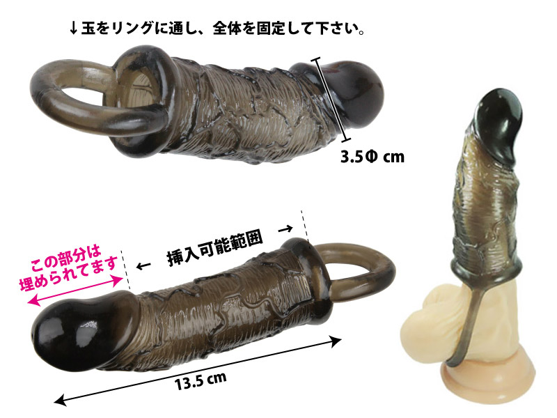 亀頭部分は素材が詰まっていますので、その分だけ長さもアップ!ペニスサックを広げて根元まで被せ、ズレ防止に役立つ玉掛けリングを引っ掛けるだけで準備完了!サイズアップに加え、持続性と快感の向上を狙った機能的なペニスサックです。