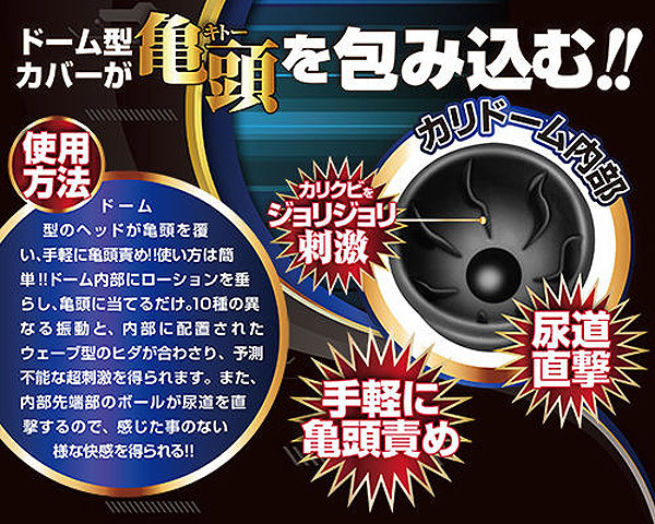 ●ハンドベルのようなボディ形状●ローションを少量塗布して亀頭へすっぽり被せたら準備完了●ワンプッシュで10種の振動パターンを操作可能●ドーム内の波打つヒダが亀頭を360度くまなく刺激●内部先端のボールで尿道刺激もお手の物。