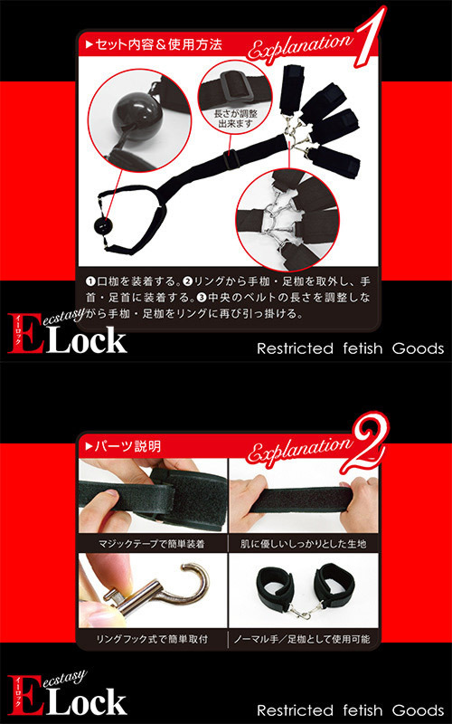 ●A-ONE×尾髭丹がコラボした「ELock」シリーズの最新作●手・足枷はマジックテープ仕様●口枷ベルトに簡単に取り付けられるリングフック●肌に優しいしっかりとした厚手生地を使用。