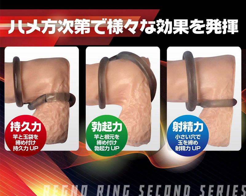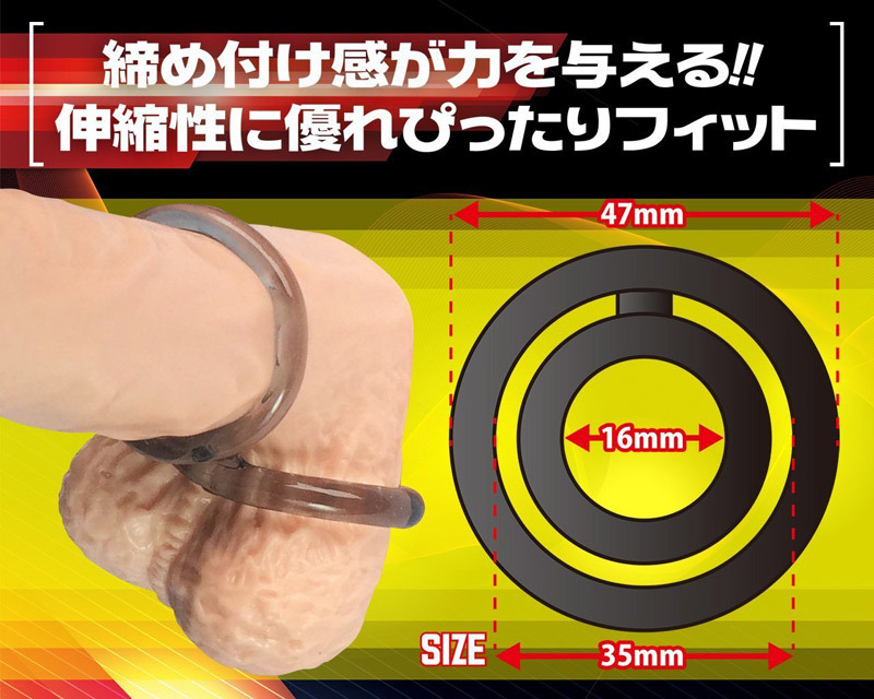 あらゆるサイズに対応する優れた伸縮素材で、大小リングはサオとタマどちらでも装着可能!ハメ方次第で持久力や勃起力、射精力までサポートしてくれる万能ペニスリングです。