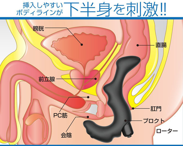 使用方法の一例:挿入したまま10分放置→PC筋やお尻の筋肉のみで動かす→馴染んできたらローターのスイッチをON!直腸の奥深くまで入り込み、快感ポイントを容赦なく刺激します。