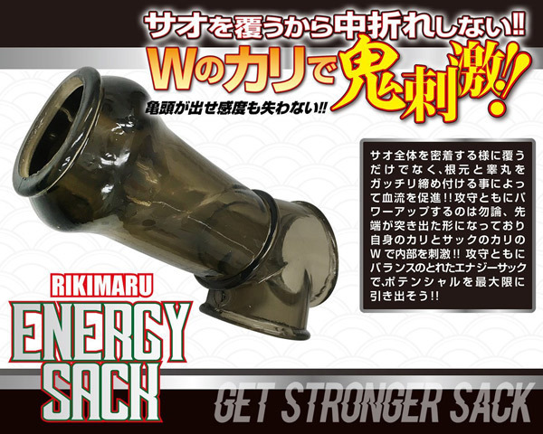 ●RIKIMARUのエナジーサックver●亀頭が丸出しになるハーフサック●根元、睾丸、竿を圧迫●自身のカリ+サックのカリでW刺激●中折れ&早漏防止に加え射精感もUP。