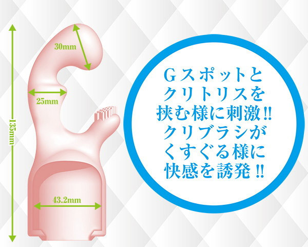 ●ヘッドを包みネック部分をホールド●ズレにくくぴったりフィット●挿入部の最大幅3cm、内径4.3cm●フェアリーミニ等の中型電マに対応●Gとクリを中と外から挟むフック形状●くすぐり刺激のクリブラシ付き●ヴァギナ&アナルのW責めも可。