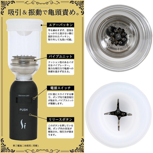 ●ON/OFFのみの簡単スライド式スイッチ●電源ONでシリンダー内の吸引&振動開始●クッション性のある内蔵イボが亀頭責め●先端の押し付け具合で刺激を調節可能●取外し&丸洗いできる柔軟エアパッキン●エアリリースボタンで吸引圧力を解除可●単三電池×2本付属(動作確認用)。