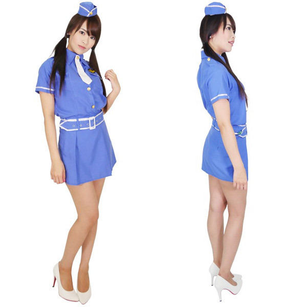 近未来系のミニスカポリスに変身♪爽やかブルーのブラウス、ネクタイ、スカート、ベルト&キャップがセットになった警官コスプレセット。
