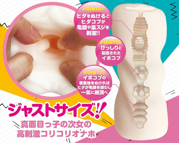 『おなガール』の血を受け継いだ新シリーズ『おなシスタ』が登場!ジャストサイズの内部は挿入直後のヒダコブが亀頭や裏スジを刺激!中間部にびっしりと配置されたイボコブの密集地を抜ければ、大きめヒダが亀頭を惑わし一気に絶頂へと誘います。
