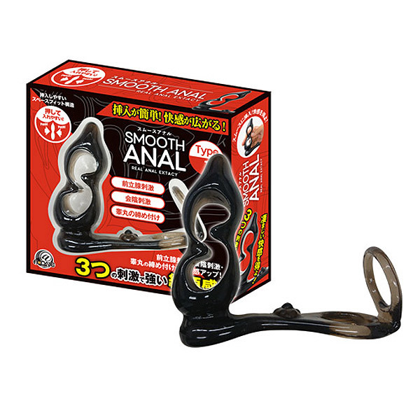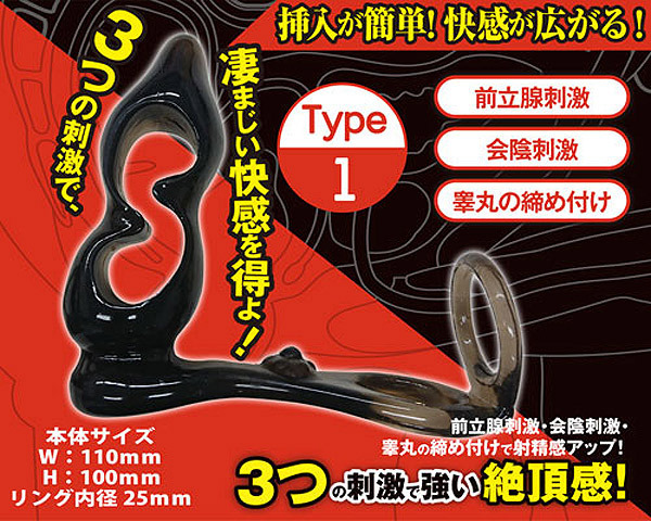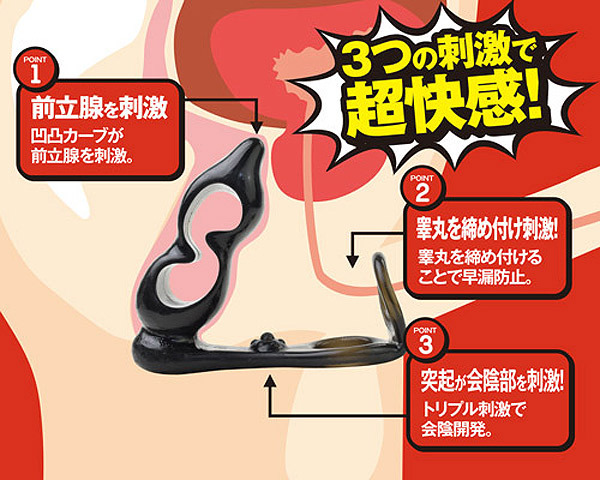 プラグの凸凹カーブが前立腺を、リングが睾丸を、突起が会陰部を刺激する3点責めの超快感アナルグッズです。