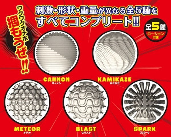 細かいヒダヒダが竿を刺激【カミカゼ】いくつもの細かな凹凸をトルネード上に配置【メテオ】無数のイボ突起が、流星の如く襲い掛かる【ブラスト】ウェーブ状に配置された突起が、カリ首を咥え込む。