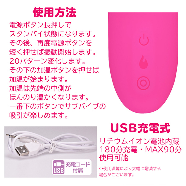 もうセックスしなくて良い気持ち良さ!中イキした事ない人にもおススメ!滑らかな触り心地と柔らかさの高品質シリコンボディにUSB充電式リチウムイオン電池による絶妙振動アクションとサブバイブによる吸引機能、さらに先端部の加温機能まで搭載した高性能バイブ。