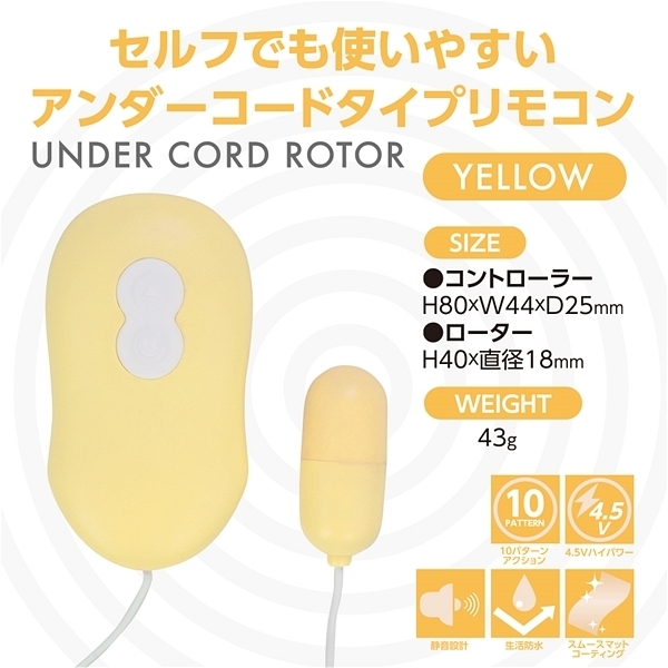 コントローラーの下側からコードが出ているためセルフプレイ時も通常時もコードの煩わしさが軽減されたスタイリッシュデザインのローターです♪握れば分かる使いやすさがウリで、他にはない使いやすさを重視したアンダーコードスタイルが特徴!単四電池3本を使用した4.5Vの強力振動マイクロモーターが搭載されていて、小径ローターで可愛いカラーバリエーション、さらにはマット加工を施すことで上質感を極めた新型ローターです♪10パターンの振動を備え、ハイパワーの4.5V仕様!生活防水仕様なのでローター本体の水洗いもできてローター部分はマット加工だから当て心地も良好♪10パターンアクションをワンプッシュで簡単にONOFF操作が可能です。