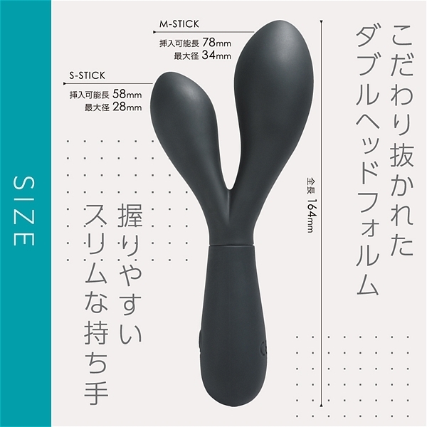 パッケージ:19.4×10.5×3.6cm 本体:全長16.4cm、大バイブ(挿入部全長7.8cm・最大径3.4cm)、小バイブ(挿入部全長5.8cm・最大径2.8cm) 重量:98g USB充電式