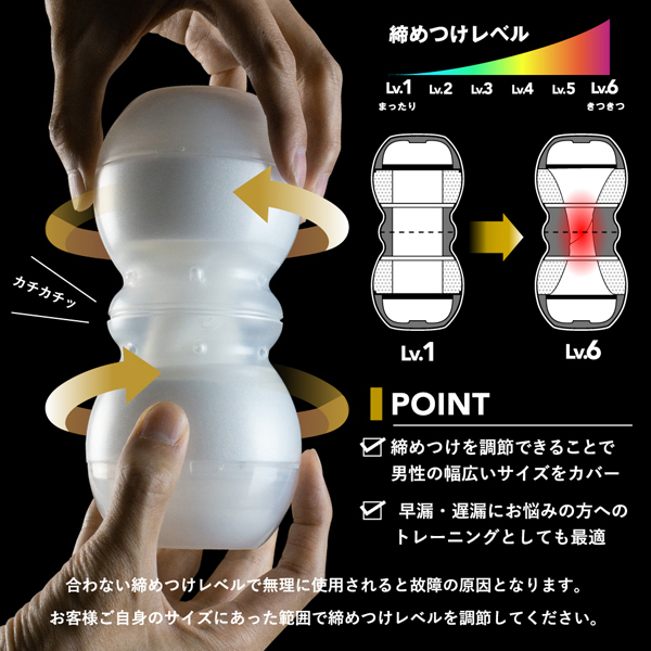 締めつけレベルは超ソフトなLv、1から極狭のLv、6までの6段階がお楽しみいただけます。