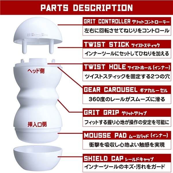 グリットコントローラーは右にも左にも回せます、右と左のひねる方向で内部構造も変化する!お好みのひねり具合で吸着感をコントロール!<内部構造>@バウンスビーズ 弾力感のある大型ビーズAボーンビーズ 背骨のように連なった縦型極小ビーズBフラップビーズ 斜めに突き出すフラップ型ビーズ