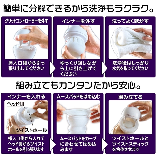 右と左のひねる方向で内部構造も変化する!お好みのひねり具合で吸着感をコントロール!挿入口のキャップを外しローションを入れて挿入。