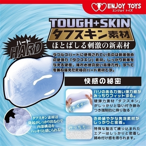 妹のスパイラルヒダと姉の多数のツブ&ヒダの両方が楽しめる!ダブルスハードに使用されているのは刺激強めの硬弾力「タフスキン」素材。