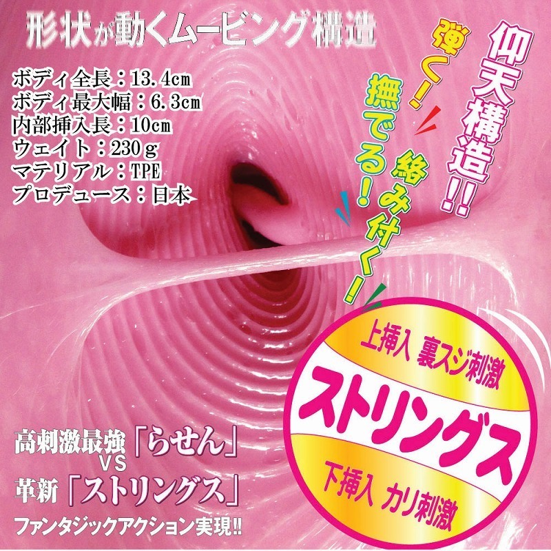 形状が動くというムービング構造には、3本のストリングスを使用!内部はヒダとストリングスで出来ていて、挿入時とストローク中に引っかかり気持ちいい!ヒダと素材の相性は抜群で、ゾリゾリ感と絡みつきが病み付きに!ふわふわモチモチ素材で、べた付きや臭いも気になりません。