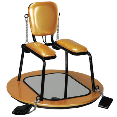 ゴールドの丸形の台座には足枷、背もたれには手枷がついていて相手を完全に拘束する。