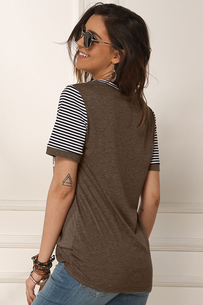 胸元でヒョウ柄に切り替えたブラウンカラーの半袖Tシャツ。