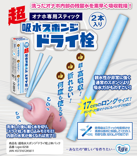 オナホユーザー必見!洗った後のオナホの内部を一瞬で乾燥!超吸収スポンジ「ドライ栓」2本パックの登場です!!よくある珪藻土スティックとは違い、PVAスポンジを採用!PVAとはポリビニルアルコールの略であり、合成樹脂の一種で、親水性が非常に強く、スポンジの密度が超細かいという特徴を持ちます!つまり水分を通常のスポンジよりも一気に大量に吸い上げる超優秀な物なのです!よくある珪藻土スティックは、とにかく良く折れて困りますよね!こちらのPVAスポンジなら折れることもなく何度も何度も乾かしては使い回しが可能!しかも2本入りセット販売なので、オナホを同時に数個乾かす事が可能ですよ!長さも17cmとロングオナホや大型オナホでも十分に届く長さ!どんなオナホでもこれを使えば一瞬で乾燥!ズブッと挿し込んで、オナホごとモミモミ揉んでもらえれば内部の水分を一気に吸い上げます!珪藻土よりさらに吸収力も強く、折れる心配もなく、しかも安く手に入れることが出来る!これからのオナホ乾燥はPVAスポンジで決まりです!