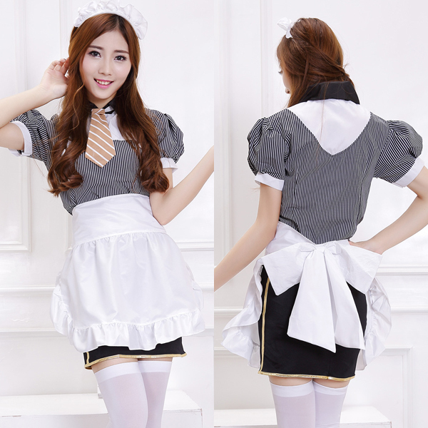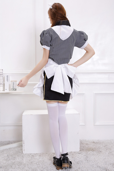 セット内容:トップス(サイドファスナー)、スカート(ウェストゴム入り・背面ファスナー、パニエ一体型)、エプロン、カチューシャ、ネクタイ(ゴムバンド仕様)