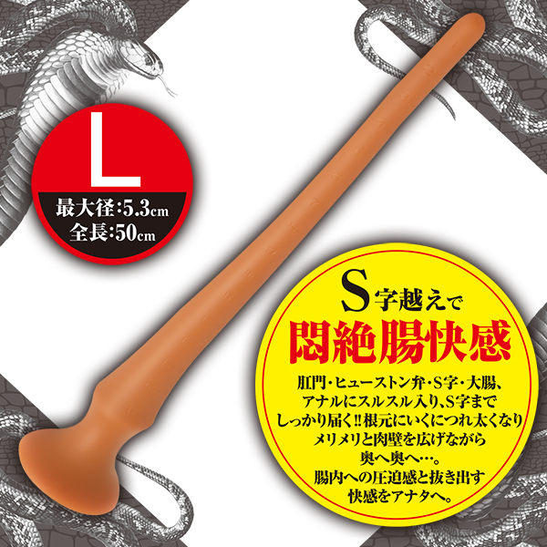 こちらはLサイズで太さはそれ程でもなく、全長50cmで最大径5.3cm!S字や大腸までしっかり届き、アナルにスルスルと入る仕様でエキスパートだけが味わえる気絶しそうなほどの悶絶快感もしっかりと味わえます♪根元にいくに連れてどんどん太くなるデザイン。
