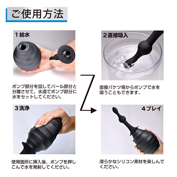 ポンプは380mlの大容量!奥まで挿入して洗浄出来るからしっかり衛生的にアナルプレイを楽しめます。