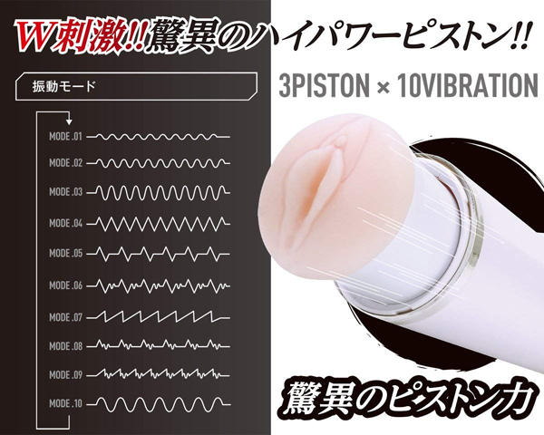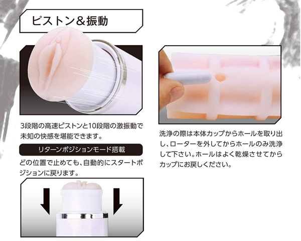 握力いらずで快感に集中できる、驚異のハイパワーを実現したピストンオナホ!ダブルの刺激とハイパワーが自慢のピストンモードを搭載したカップ型の電動オナホは他に類を見ません♪3段階の高速ピストンと10段階もの激振動で、これまでにない未知の快感を体感できます!本体上部の空洞部分には親指を通して固定できるので、握力をさほど使わずに使用可能。