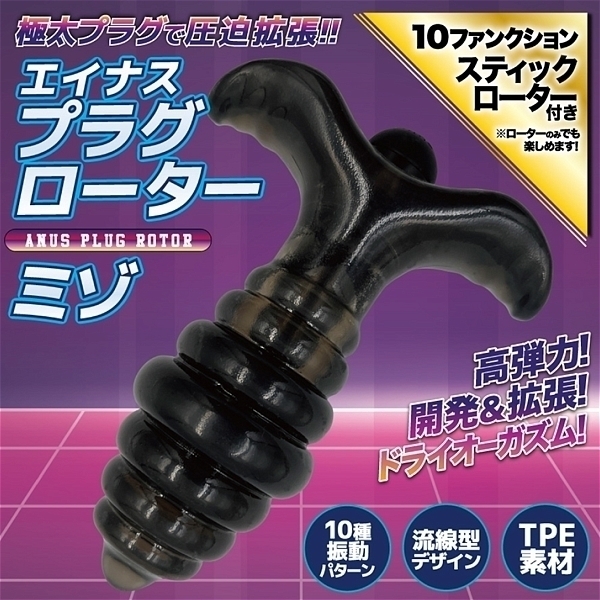 開発!拡張!圧迫!アナル快感の魅力を徹底追求!アナルプラグに振動10アクションをプラスした、「エイナスプラグローター」!オンオフできるよう取り外し可能なスティックローターで、振動アクション10パターンを搭載。