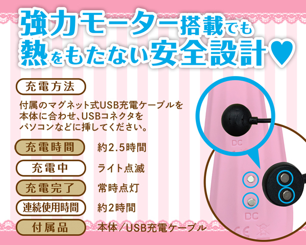 素材には柔らかなシリコンを採用、振動は5種類のパターンと3段階強弱を搭載!超強力モーターが生み出す快感を貴方も体験しよう♪完全防水、2.5時間充電で2時間連続稼働