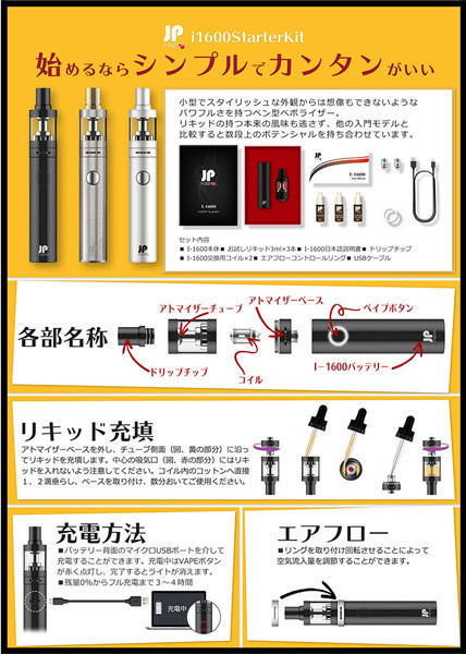 セット内容:I−1600本体、お試しリキッド3ml×3本、日本語説明書、ドリップチップ、交換用コイル×2、エアフローコントロールリング、USBケーブル USB充電式