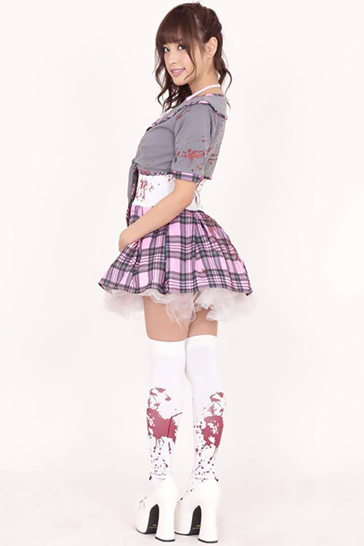 ●グレー×ホワイト×ピンクチェック●ワンピース・ボレロ・ネクタイのお得なセット●ボリュームたっぷりのパニエ付きスカート●血痕プリントがリアリティ満載。