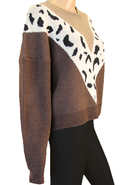 ヒョウ柄模様がV字にデザインされた暖かなニットセーター。