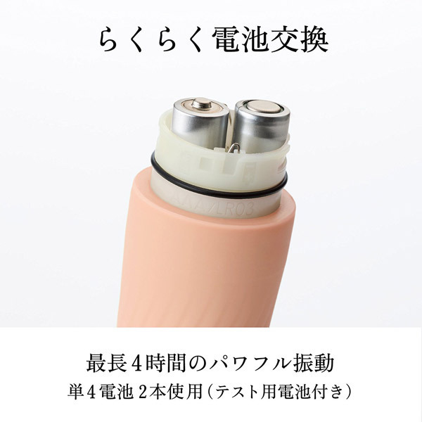 最長4時間のパワフル振動、単四電池×2本(テスト用電池)付属。