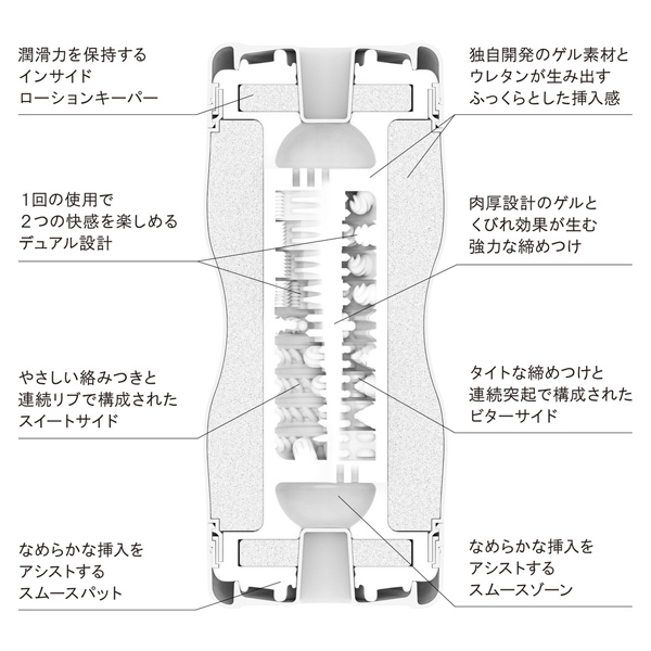 プレミアムなダブルの快感がもたらす締めつけは、厳選された最高品質の素材と長年の実績の賜物!双方向から楽しめるプレミアムなWの快感。