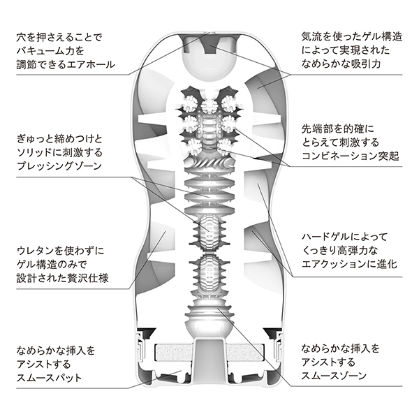 これまでのテンガシリーズとアウター感は同じですが、内部の中間素材にウレタンを使わず「エアクッション」を採用したことでこれまでにない挿入感を実現しています♪超ハード設計で極上の絡みつき!螺旋状に配置されたゲルの柱構造による独自のエアクッション構造が、ウレタンでは再現不可能な繊細でやさしい弾力を実現♪絡みつくように設計されたディテールとエアクッションによる繊細な弾力!内部構造もハードな構成でヒダ細かく刻まれた突起、カリを撫でるヒダ、最奥の亀頭を撫で回す四方からの突起と尿道へのアタック、これらのギミックが所狭しと待ち構え、バキュームコントロールすることで変化する挿入感と共に射精感を高めてくれています。