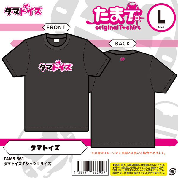黒の半袖Tシャツに「タマトイズ」のテキストと可愛いロゴをプリントしたファン必見の公式グッズ、通称「たまT」が登場。