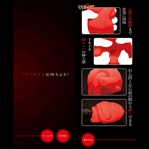 心臓の形を見事に再現した異世界チックな非貫通オナホ「GRASP HEART」です♪脈打つ血管に右心房、左心房までも再現された見た目はインパクト絶大!心筋の冠動脈まで忠実に再現されていて、ドキドキの胸キュンの挿入感は新鮮味バツグン♪挿入は右心房と左心房の間から入れる形でヒダ系が連続する内部構造に興奮必至!グッと身が縮こまった触感やリアルな造形にドキドキすること間違いなし♪ユニーク性とフェティッシュ系の楽しさをぜひお試しください。