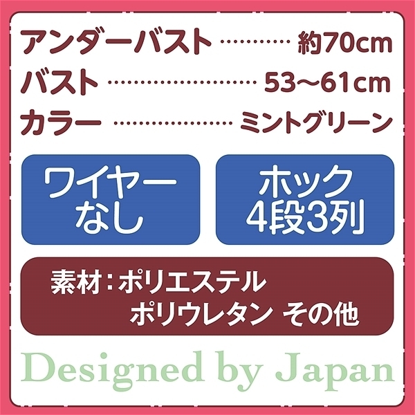 ブラジャー:アンダーB約70cm・B53〜61cm・ホック4段3列・ワイヤーなし パッケージ:22.0×14.0×7.0cm 重量:60g