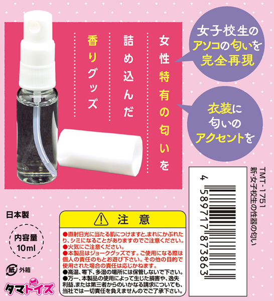 新製法エタノールフリー、女子校生のアソコの匂いを完全再現、リアルな匂いに大興奮!!発情した女子校生の濃厚な匂い、女性フェロモンたっぷりの淫臭、匂いで感じる新感覚、あのとき感じたあの匂いをもう一度、女性の特有の匂いを詰め込んだ香りグッツ、衣装に匂いのアクセントを。