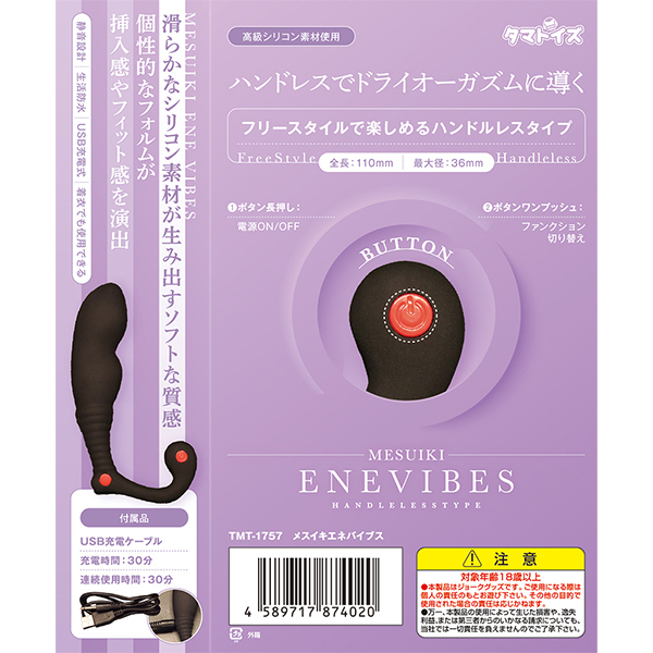 サイズは全長110mm、最大径36mmで、コンパクトながらも効果的な前立腺刺激を提供します♪前立腺を圧迫する挿入シャフトの絶妙な太さと、内蔵する振動モーターによる多彩な振動!さらに会陰を圧迫して外側からもレスポンスよく前立腺を刺激します♪このドライオーガズム誘発アナルバイブは、普段ハンドルありを使っている方には全く新しい体験を提供します!●メーカー型番:TMT-1757