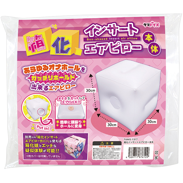 あらゆるオナホールをしっかりとホールドできるエアピローです♪本体サイズは30cm×30cm×30cmの立方体デザインで、安定感のある設計となっています!別売りの「箱化インサートエアピローカバー」を装着することで、好みのイラストデザインでリアルな疑似体験が楽しめます♪膨らませる際は、別売りの空気入れを使用するとスムーズにセットアップが可能です!高品質なビニール素材を採用し、耐久性にも優れています♪お好きなオナホールを組み合わせて、よりリアルな体験をぜひお楽しみください!